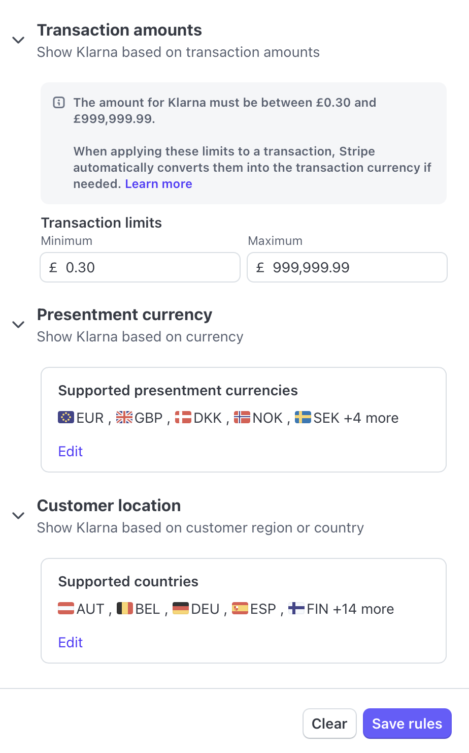 You can now set rules for Klarna here. Keep in mind when using Klarna the Stripe fees are different so this is something you’ll want to think about when using Klarna. But you can set a minimum price for which you want Klarna to be an option so if you don’t want customers to use Klarna for a low price you can set that here.