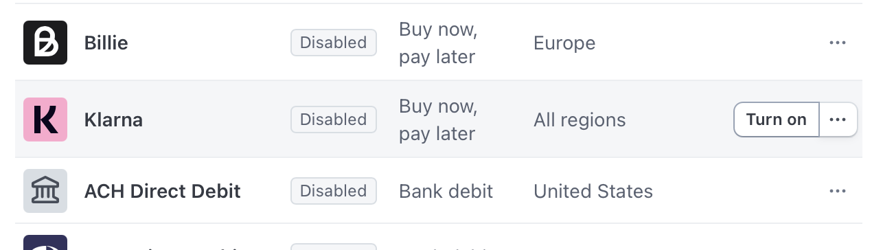 First you need to set up Stripe to allow Klarna on Payment links. Visit: https://dashboard.stripe.com/settings/payment_methods and click on your active configuration in order to edit. Scroll down to Klarna and click ‘Turn on’ once it’s enabled click ‘Customise availability’