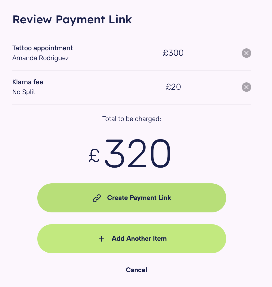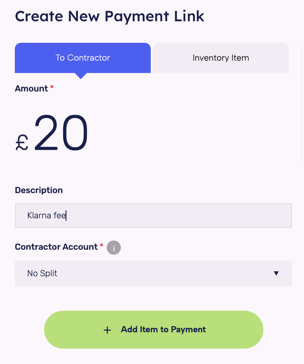 You can do this in SplitSum by creating a multi item payment link, you first add the appointment itself a description, cost and the contractor who performed the service. And then add a no split line item for the Klarna fee: